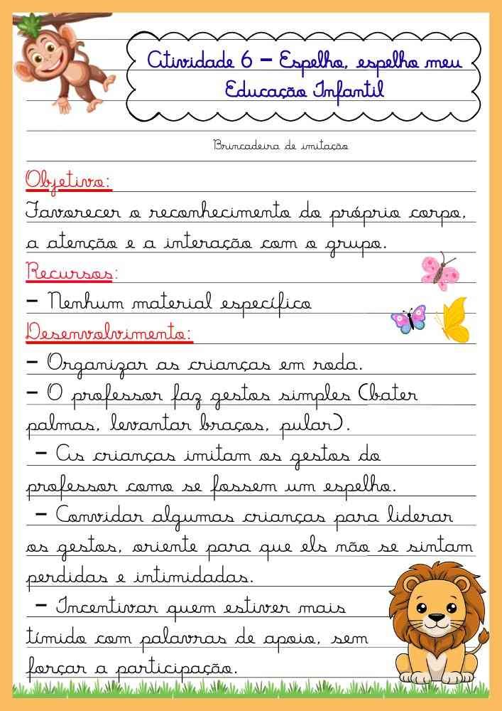 Em sala, jogos de imitação, comandos simples e deslocamentos organizados costumam funcionar bem, pois unem diversão, atenção e organização do grupo.